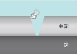 亜鉛めっき皮膜は、鋼を完全に覆うことによって鋼を腐食から守りますが、万一めっき皮膜が局部的に欠損し、鋼が露出しても、周辺の亜鉛が鉄より先に溶けだすことにより、鋼は腐食しません。