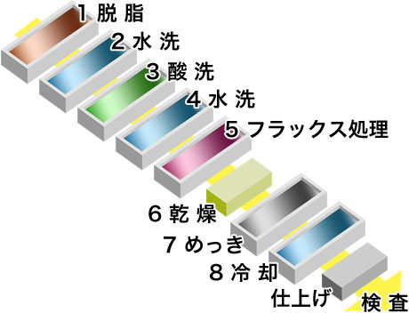 - 酸洗後のさびの発生を抑え、鉄と亜鉛の合金反応を促進させるため、加熱した塩化亜鉛アンモニウム水溶液(フラックス)に漬けて、素地表面にフラックス皮膜を形成させます。