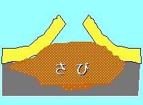 | さびの生成後 | ![]() 緻密なさびの薄膜が 保護皮膜となっている | ![]() 鉄さびは保護能力が少ない ので、さびが進行する。 |