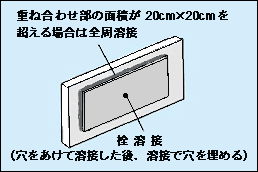 プレート面積が大きい場合は、それぞれをめっきした後、ボルト接合とするか、または左図のように400平方センチメートルを超えるごとに1個所の栓溶接をすることも一方法です。